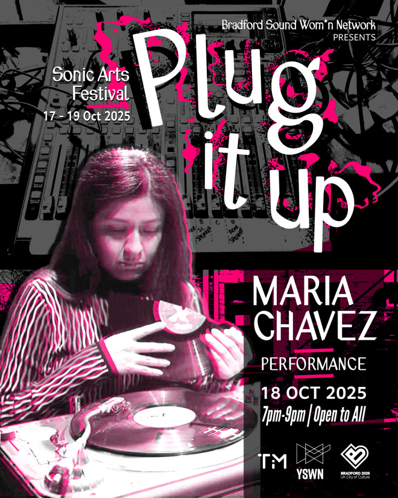 Maria Chávez, Peru, is an improviser, curator, and sound artist. She moved to Texas at age two, and at 16 she began working with sound and turntables. Chávez’s work includes sound installations, visual objects, and live performances that explore the value of accidents and the unique possibilities of sound-emitting machinery like turntables. Her experimental turntablism, influenced by contemporary art and improvisation, focuses on the paradox of time and the present moment. She uses both new and broken needles, which she calls “perfect to ruin,” to create a distinctive sound palette from vinyl. Chávez layers broken shellac and vinyl to create live sound collages in real-time.